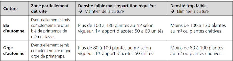Nivelez la parcelle et augmentez la densité de semis de 10-20% pour compenser les dégâts. Utilisez la herse étrille ou la houe rotative selon le stade de la culture.