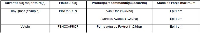 Pour les parcelles avec du Vulpin et sans Ray-Grass, on peut aussi utiliser des produits à base de FENOXAPROP.