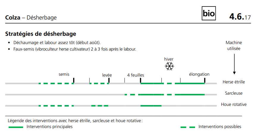 Le colza est une culture réservée aux parcelles aillant un historique de bonne gestion du salissement en adventices. Les solutions mécaniques sont souvent à double tranchant car le colza est une plante supportant mal les passages de herse. C’est une culture très sensible dans les premières semaines, et son rendement (voir sa survie) peut très vite être mis à mal par la présence d’adventices. Le réglage des outils de désherbage doit être fin et méthodique, adapté à chaque parcelle.