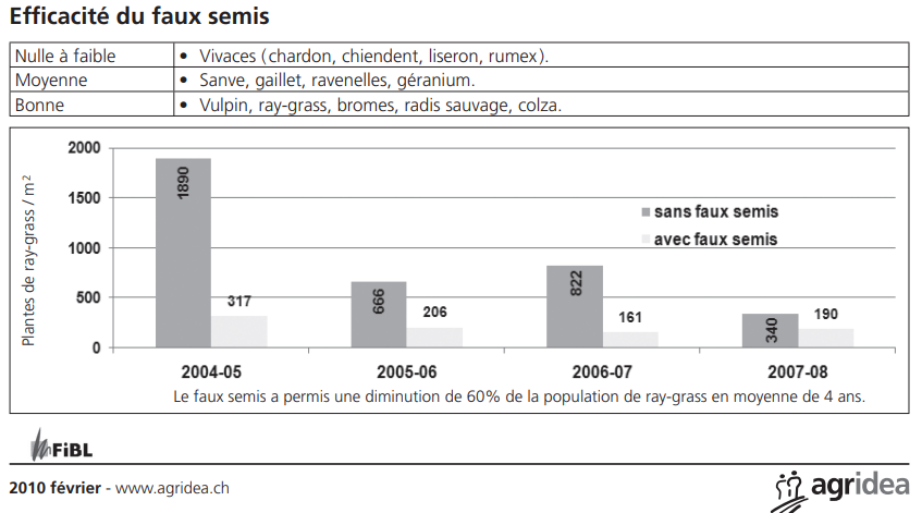 Le faux-semis peut être contre-productif s’il est réalisé trop tardivement. Le risque est d’avoir une levée des ray-grass en même temps que la culture. Notamment si le faux semis est trop proche du semis ou lors de période trop sèche. La levée des adventices sera alors déclenchée avec le retour d’humidité qui peut parfois correspondre au semis ou levée de la culture.