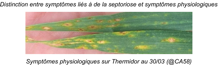 Des taches sont apparue sur certaine variétée suite à la baisse des températures. Attention à ne pas confondre la septoriose avec des taches physiologiques, certaine variété marquent beaucoup plus que d'autre avec les amplitudes thermiques. La septoriose progresse du bas vers le haut tandis que les tâches physiologiques n’affectent que la partie supérieure du feuillage.